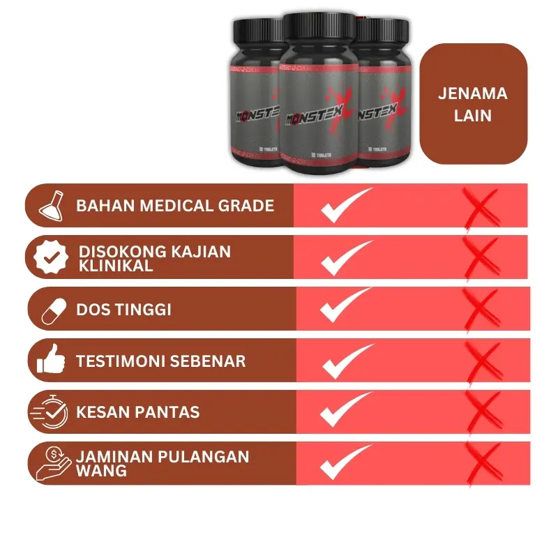 Jika produk kami tak membantu tingkatkan tahap kesihatan anda selepas habis sebotol, kami akan pulangkan semula 100% wang anda. Anda dapat jaminan sekuat ini kerana kami ada bukti & pengalaman membantu ramai pengguna yang mempunyai masalah SAMA SEPERTI ANDA sebelum ini dan berjaya membuktikan Supplement Monstexx ini memang TERBUKTI BERKESAN!